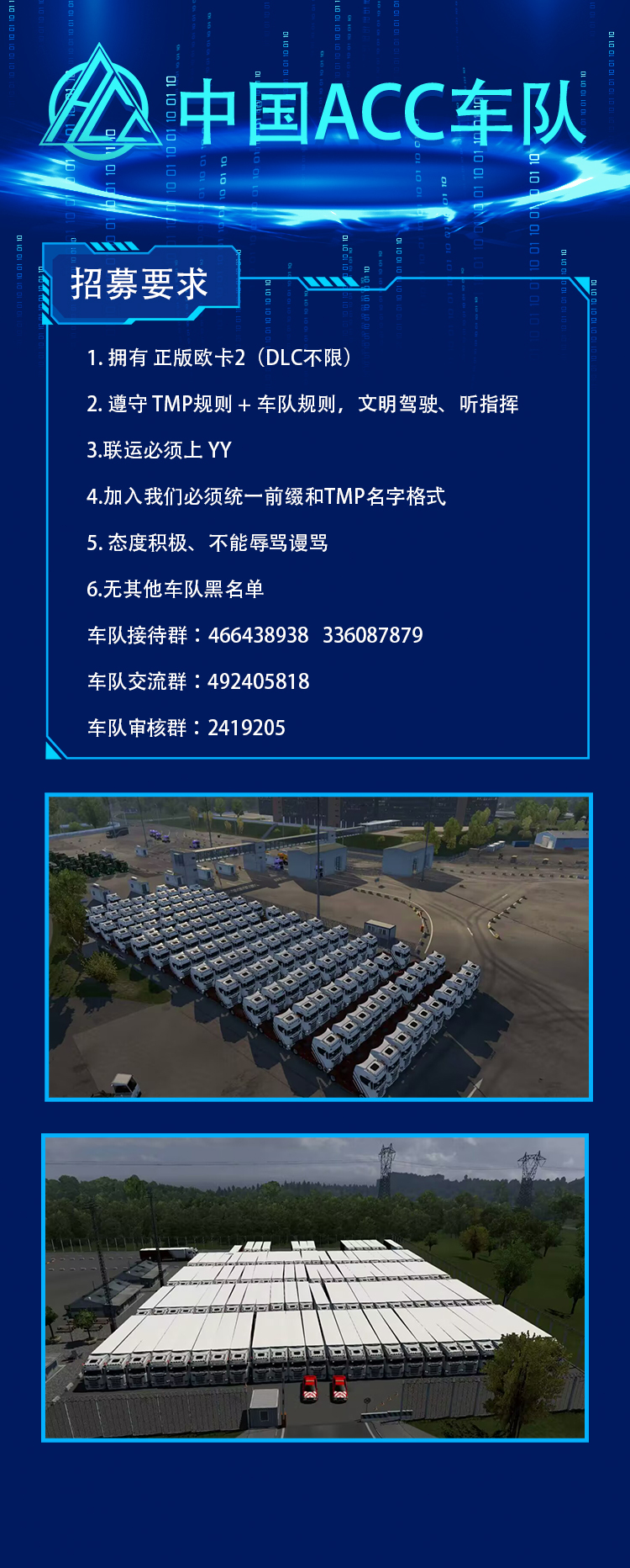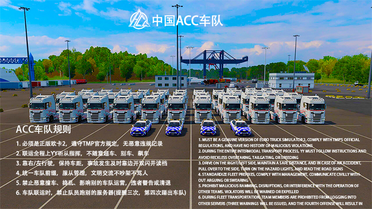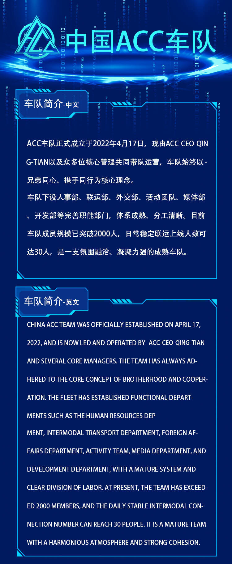 中国ACC车队成立于2022年4月17日,车队拥有完整的管理体系包括,招募团队,技术团队,活动团队,联运管控等车队在编140人,日常联运上线15+ 并在不断发展壮大中 ACC车队致力于打造欧卡最优秀的车队,车队秉持着“在一起,再出发”的理念成立,车队成立至今参加了数十次大联运联运,中国ACC车队期待你的加入。