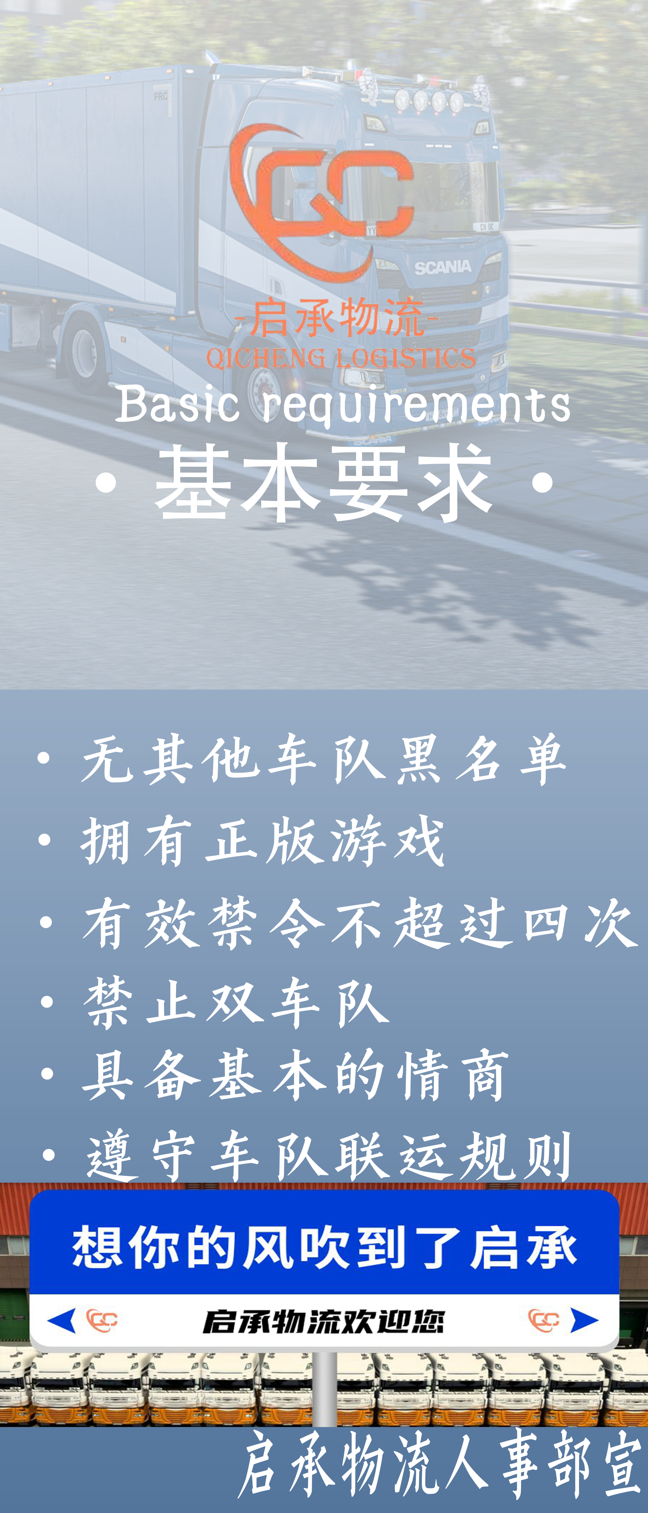 启承国际成立于2022年6月20日,车队目前在队320+人,接待QQ群: 764825407,日常联运15+,车队已开启积分制奖励【手柄 加速器 水杯 定制物品 茶叶 等】。车队主打娱乐,来了就是一家人,唯一要求:活动联运期间不能在其他服务器跑车。启蒙未来 承蒙厚爱,本车队拥有多名技术人员为您游戏问题进行解答,车队秉承将队员转化为兄弟的理念,联运超过一定人数我们会在yy抽奖品如抱枕水杯之类,目前已有队员抽取抱枕以及其他奖品,启承国际招收股东管理队员,我在启承国际等着您到来