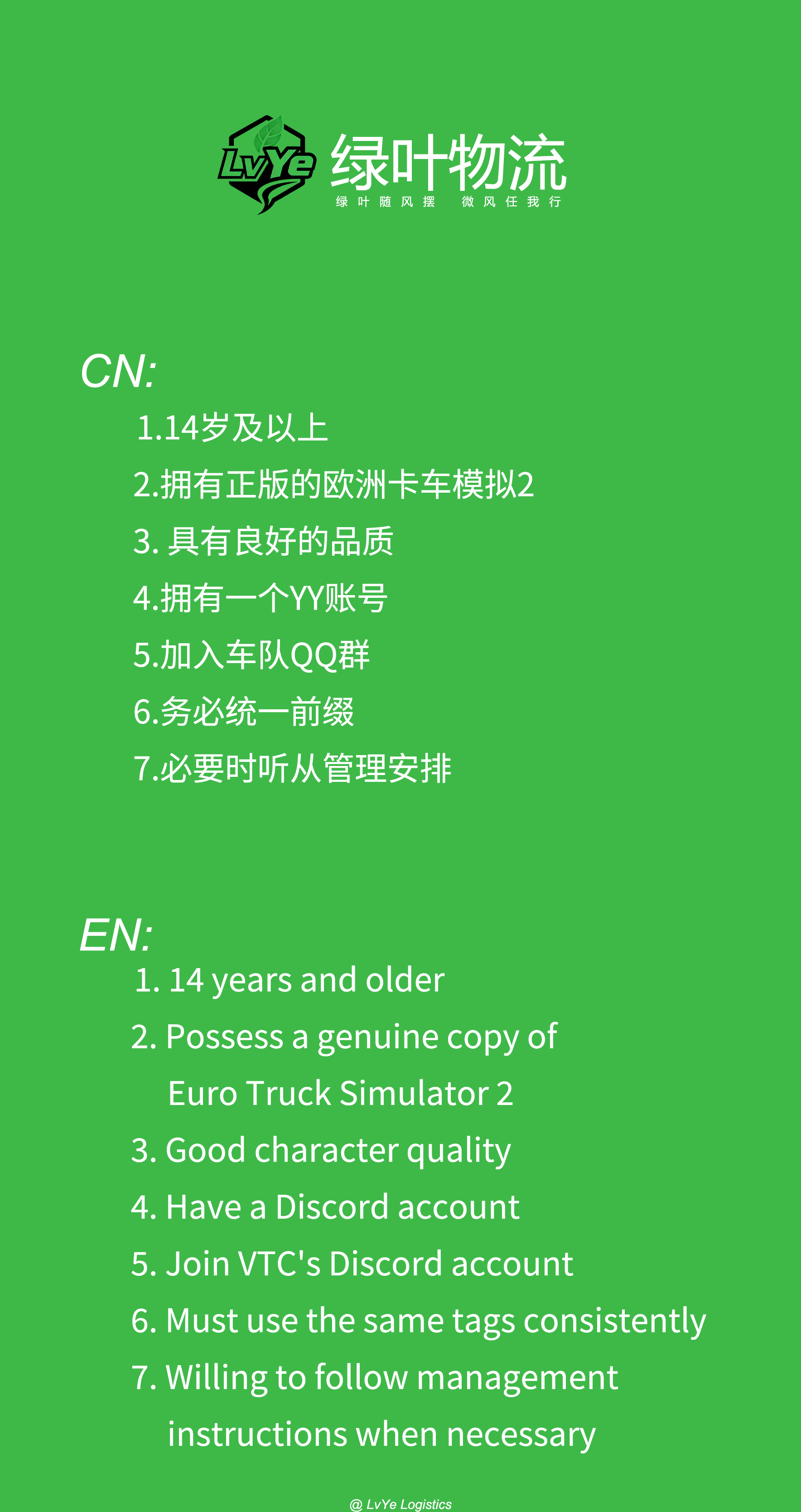 入队要求: 1.18岁及以上 2.拥有正版的欧洲卡车模拟2 3.具有良好的品质 4.拥有一个YY账号 5.加入车队QQ群 6.联运时更改统一格式的前缀 |